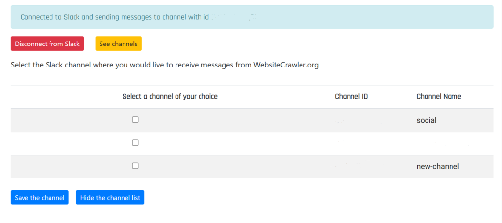 Click this button and complete the OAuth authentication. Once the OAuth authentication is successful, you’ll see a button “See channels”. Click this button. WebsiteCrawler will now show a list of channels available in your workspace.