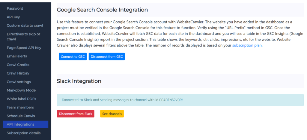 Our platform enables you to register a new account and sign in with your login credentials and sign in with Google. Log in to your WebsiteCrawler account and visit the settings page. Click the “API Integration” menu and find the button “Connect to Slack”.