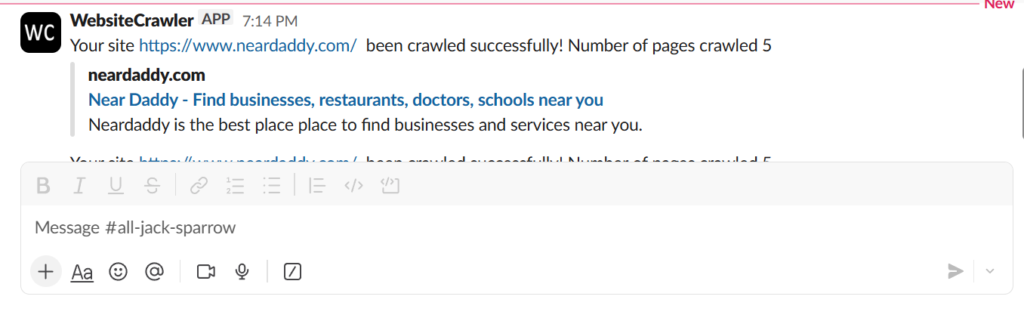 Crawl completion alerts: If you run a crawl, you don’t have to keep your eyes glued on the list of processed URLs displayed by WebsiteCrawler. Once the crawl job is complete, you will immediately get an alert message in your chosen Slack channel.